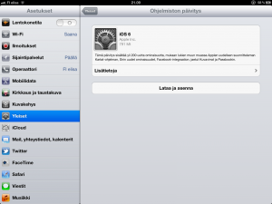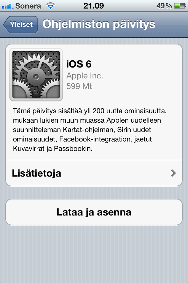 Ja tuo on pelkän käyttöjärjestelmän päivitys. Lisäksi App Storessa oli välittömästi hyvin monesta ohjelmasta iOS 6 – versio. Noiden lataaminen over the air (OTA) oman datapaketin kautta siis syövät suoraan kk-kulutusta ellei käytössä ole esimerkiksi ADSL-linjan takana olevaa langatonta verkkoa.
